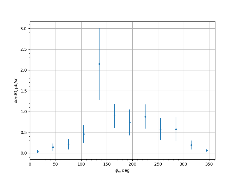 | cos(θπ) | φπ, [deg] | dσ/dΩ, [μb/sr] | uncertainty |